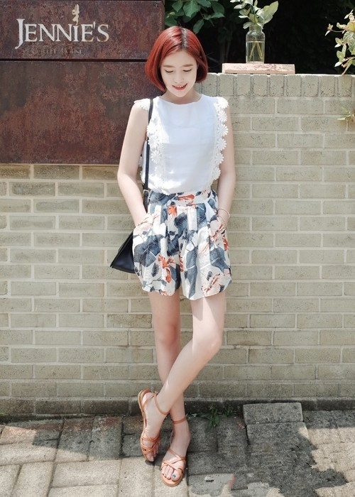搭配看点:白色T恤搭配印花短裙非常适合小个子女生,将T恤扎进裤头,轻松提升腰线,让双腿更显修长。