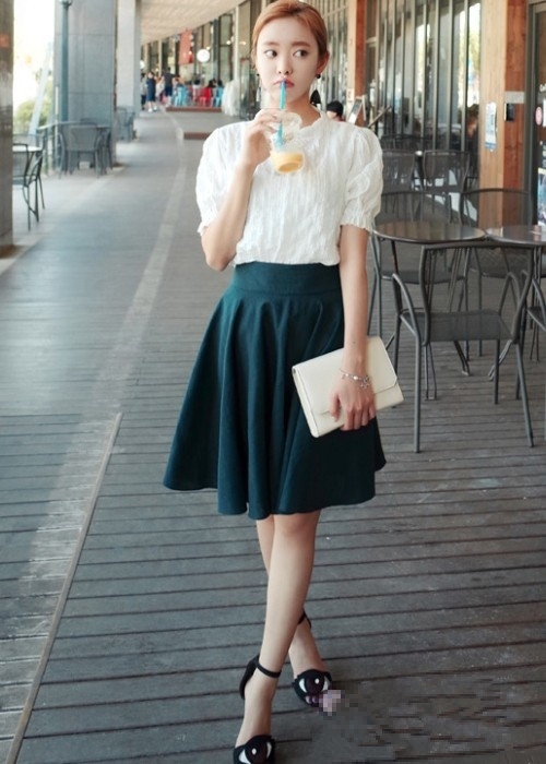 搭配看点:白色T恤搭配墨绿色复古高腰伞裙很有名媛气质,配上一款简约的白色手拿包更显优雅,职场OL可以尝试哦。