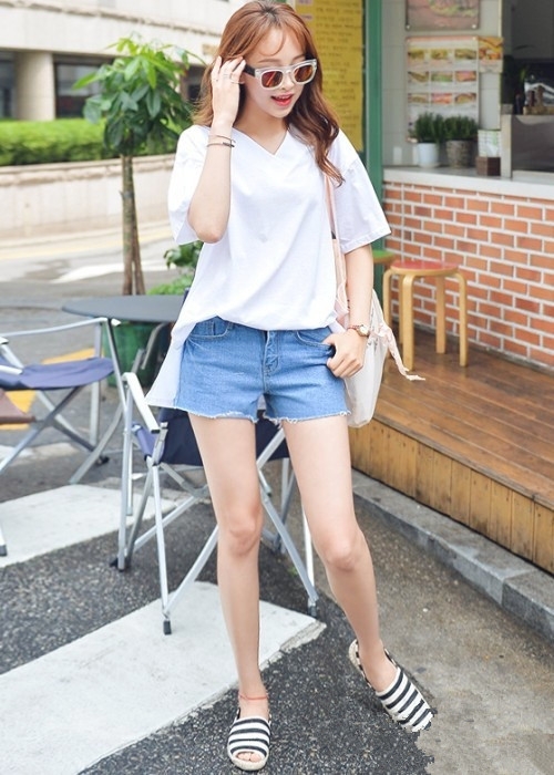 搭配看点:白色T恤搭配清新的牛仔短裤很有文艺少女气息,配上浅色斜挎包,瞬间变身夏天最清凉的美丽风景。