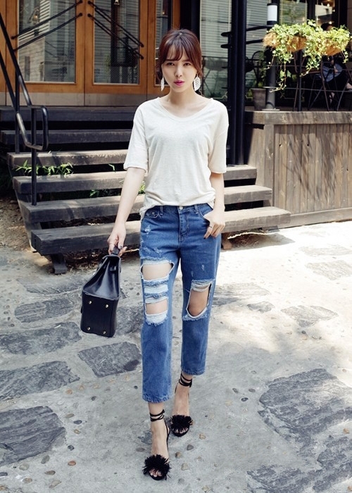 搭配看点:白色T恤搭配破洞牛仔裤十分的率性不羁,配上时尚的系带高跟鞋,兼具性感与酷感,夏季就要美出新高度。