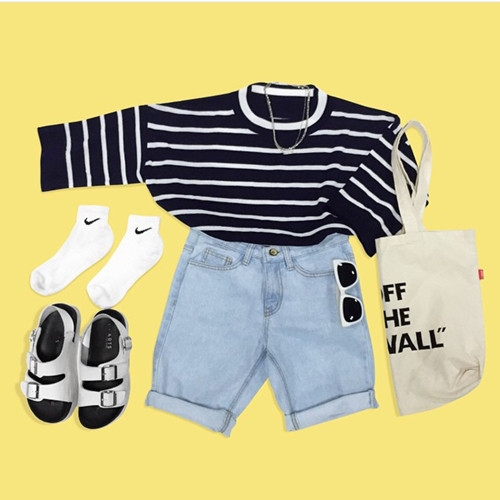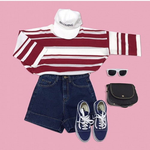 红白条纹T+牛仔短裤+蓝色休闲鞋+棒球帽+零钱包