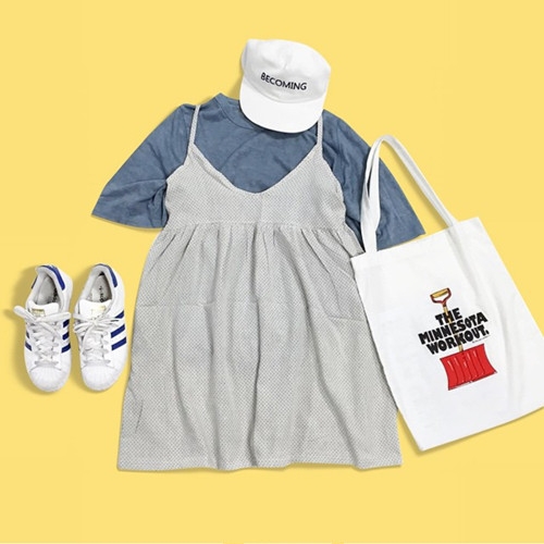 烟灰蓝Tee+浅灰色吊带连衣裙+棒球帽+布袋包+白球鞋