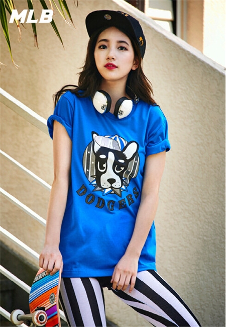宝蓝色的卡通T恤搭配竖条的运动裤青春耀眼,让人感受到一抹清凉。秀智还搭配了棒球帽和渔夫帽等,实用的同时更加时尚帅气。