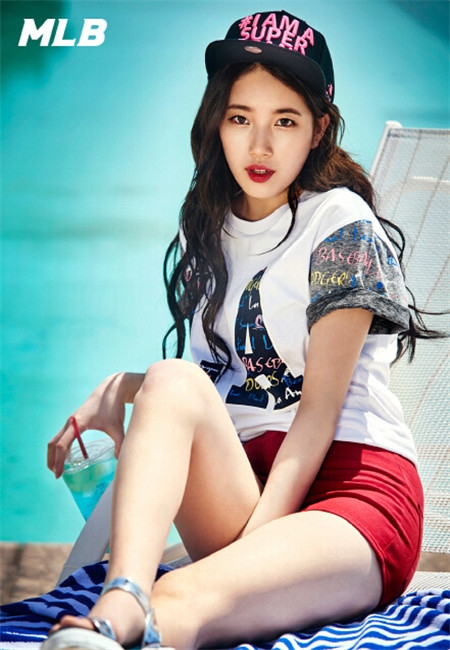 坐在沙滩上的秀智腿上若有如无的沾着沙,亮眼的红色嘴唇和帽子的颜色相称,服装懒散随意。