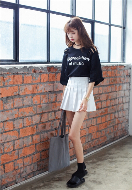 这款白色蝙蝠袖字母T恤,字母一直都是流行元素之一,经典黑白搭配,百褶裙带点校园的风格,清新大气,宽松的版型,上身很舒适清凉了。白色的高腰裙搭配,很有个性魅力哦。