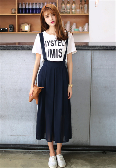 白色的字母T恤给人清新素雅的感觉,搭配蓝色纱长裙和白色平底球鞋,反而更加凸显甜美的气质。纱质的背带半身裙,有点透视,可爱中带点小性感,是甜美系女生不能错过的搭配。