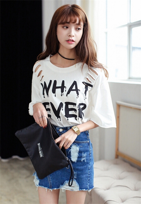 这款圆领中袖字母T恤,纯净的白,清新唯美。黑色的大字母,肩膀上的破洞,别具匠心,搭配牛仔短裙,简约有范,很实用哦。衣服宽松,包臀牛仔裙,能显瘦。