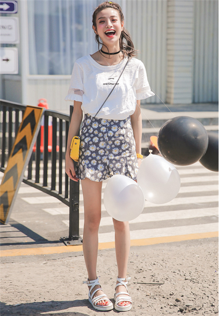 白色字母T恤在给人格外的清爽感,蕾丝花边袖口装饰打破单调感,搭配碎花高腰荷花边短裙,鞋子选择白色的绑带凉鞋,时尚感爆灯。