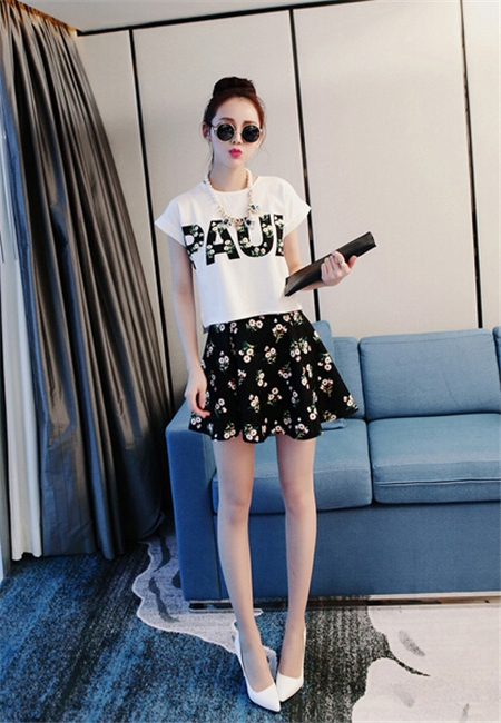 白色字母T恤很有特色,字母上的花和裙子上的花式一样的,套装搭配很有感觉,相互相应,如果怕太过剪刀可以在脖子上添加小配饰,起到画龙点睛的作用哦。