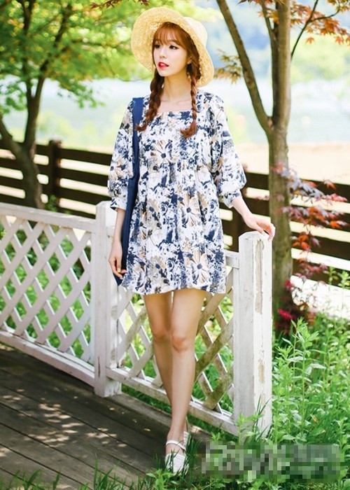 搭配看点:深蓝色系碎花连衣裙配以中袖设计,更添田园气息,配饰上选择一定编织宽檐帽,提升时尚指数又遮阳解暑,鞋子选择白色平底鞋更显清新纯净。