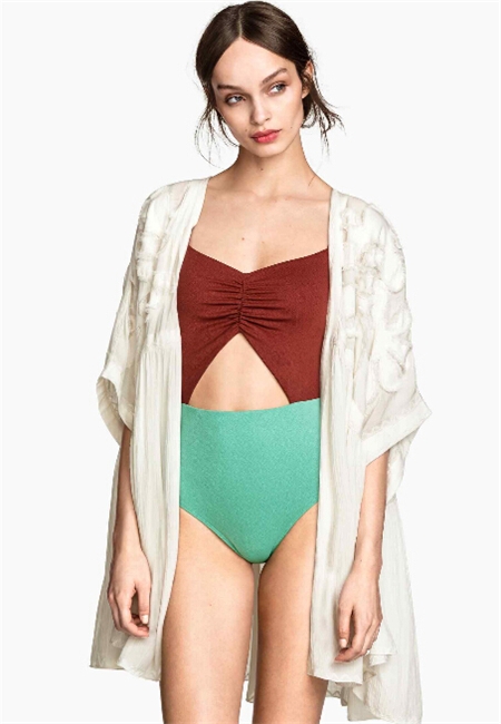 其实梨形身材穿泳衣还是别有一番风味的,只要尽可能地大秀腰部的线条你就基本不会出错了。这种在你最宽的部位做成围起来的设计很适合臀围宽的女生。