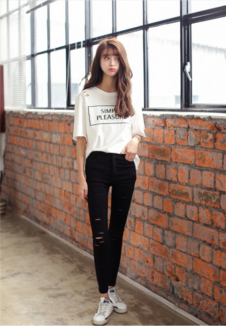 中袖的白色字母T恤非常简约,T恤肩膀上的小洞,增添性感气息,搭配黑色紧身破洞牛仔裤,宽松的设计适合各种身材,十分时尚。