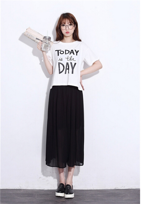 黄色字母T恤+黑色阔腿裤+白色增高鞋