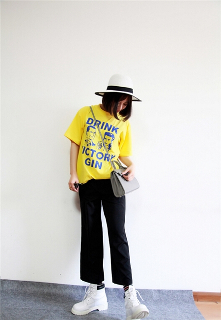 适合职OL们T恤穿搭法,黄色字母T恤搭配黑色阔腿裤,展现最具时尚感的一面,一抹亮眼的感觉,让你成为时尚女王。
