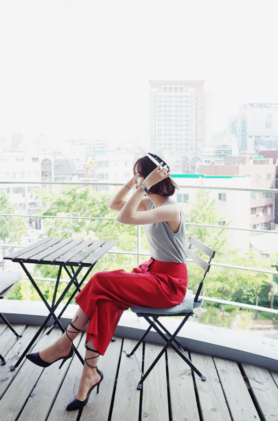 搭配看点:灰色背心搭配红色高腰阔腿裤显得十分优雅,配上女人味十足的尖头高跟鞋更添气场,头上的白色礼帽点亮造型又十分时尚,整个搭配非常柔美清新,适合职场lady上班或出街选择。