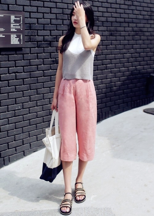 搭配看点:灰色背心搭配粉色阔腿裤很有气质女神范儿,就算是搭配一款学院气息十足的布袋包也显得清纯美好。