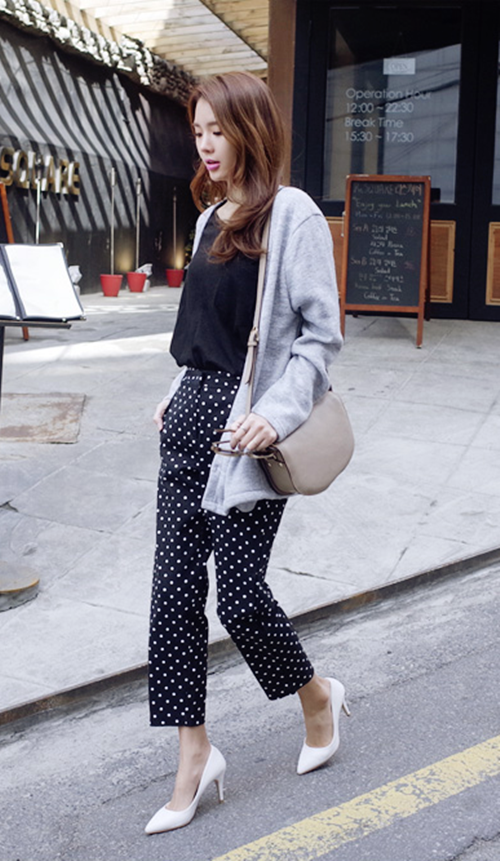 搭配看点:黑色背心搭配带有波点或条纹等潮流元素的休闲裤也十分甜美,配上浅口高跟鞋,轻松穿出清新气质。