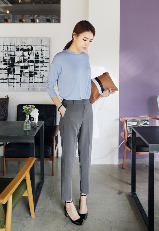 搭配看点:蓝色上衣搭配灰色裤子很有职场lady气质,尤其是搭配修身的灰色哈伦裤或西裤,再搭配一件尖头高跟鞋,轻松蹬出高冷气质。