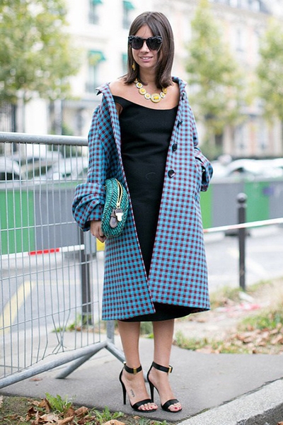 示范一:黑框墨镜+蓝色格子风衣+黑色一字肩连衣裙+黑色系扣凉鞋