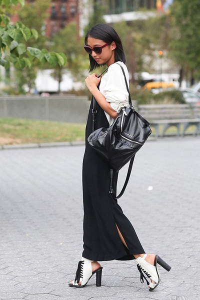 示范二:白色防晒衫+黑色开叉连身裙+白色绑带高跟+黑色双肩皮包