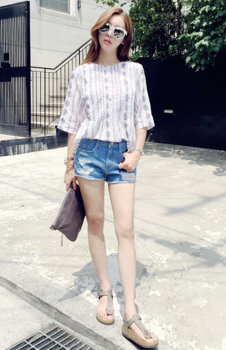 LOOK 1:印花上衣+破洞牛仔短裤+凉鞋+手拿包