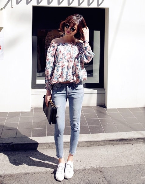 LOOK 2:印花上衣+牛仔裤+休闲鞋