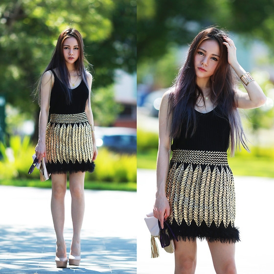 示范一:黑色金纹连衣裙+裸色链条包+裸色高跟鞋
