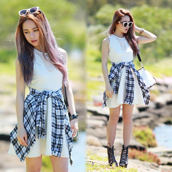 示范三:白边墨镜+白色连衣裙+白色肩包+格子衬衫腰饰+黑色绑带高跟鞋
