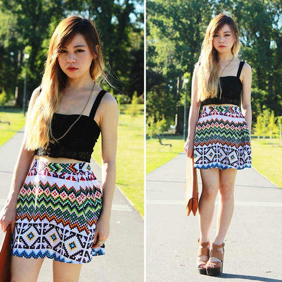 示范二:黑色吊带短款背心+棕色手包+民族风情小短裙+棕色防水台高跟
