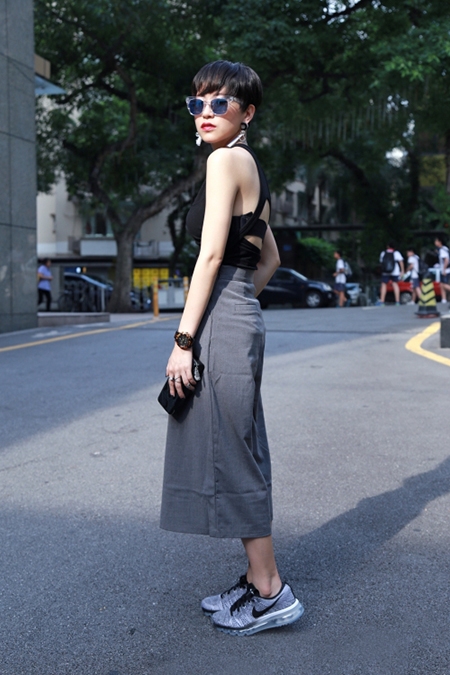 何穗最新街拍,灰色毛衣+墨绿色光泽感半裙,文艺慵懒,少女感十足。马海毛毛衣来自H&M,手提包和粉色毛拖鞋均来自Gucci,半裙来自Tibi 2016