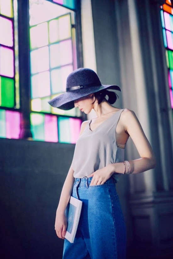 LOOK 6:灰色背心+牛仔裤+宽檐帽