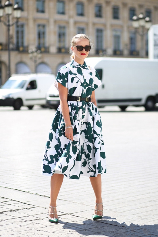 搭配看点:复古印花连衣裙搭配同色尖头鞋,让造型更加统一有范,也更显高哦。