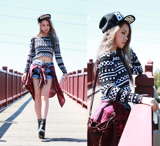 黑色嘻哈棒球帽+黑白条纹短款上衣+棕红色单肩包+红色格子衬衫+牛仔短裤+褐色高跟靴
