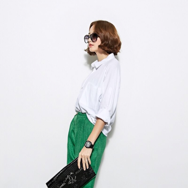 白衬衫+绿色哈伦裤+黑色手拿包