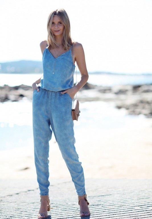 牛仔连体裤+裸色凉鞋+裸色链条方包