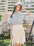白色棒球帽+蓝色条纹衬衫+白色蕾丝半身裙
