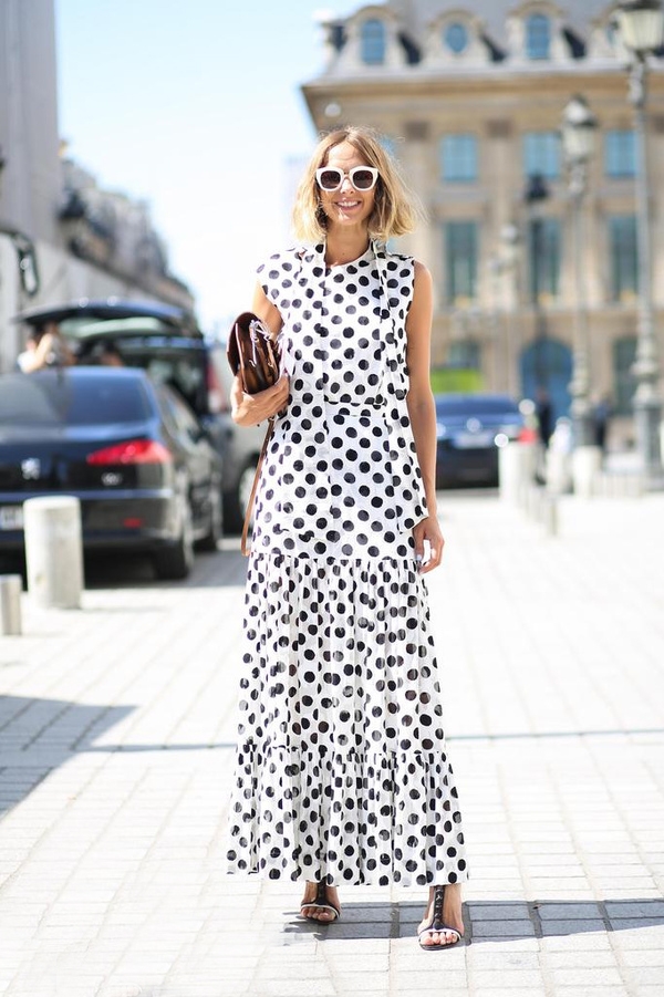 白色墨镜+黑色波点雪纺连衣长裙+棕色手包+黑色铆钉高跟凉鞋
