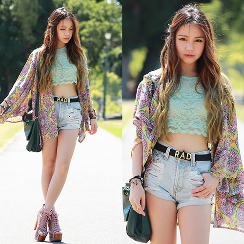 绿色短款蕾丝背心+牛仔短裤+印花防晒衣+粉色高跟鞋