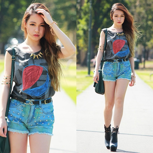 灰色T恤+铆钉牛仔短裤+黑色高跟靴+墨绿色肩包