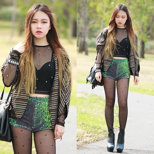 黑色蕾丝上衣+条纹外套+反光短裤+黑色爱心波点丝袜+黑色高跟靴