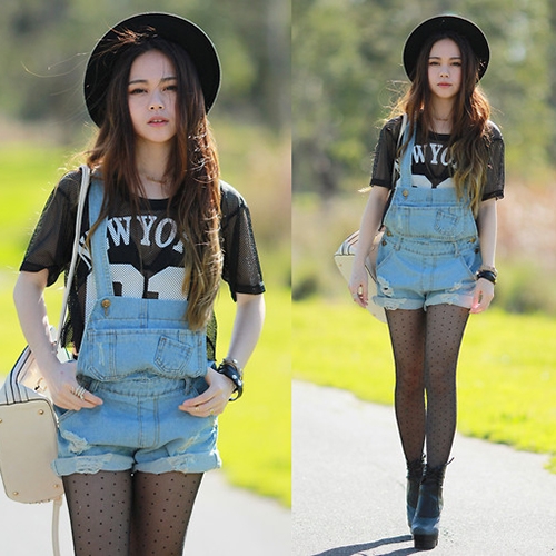 黑色小礼帽+黑色T恤+背带牛仔裤+黑色小波点丝袜+黑色高跟靴+白色双肩皮包