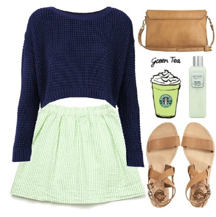 搭配看点:绿色裙子搭配藏蓝色上衣不是很好看,不过可以参考这款上衣的款式,短款的设计露出高腰线,在视觉上更加显高,菇凉们也可以选择在夏天搭配短上衣,轻松穿出大长腿儿。