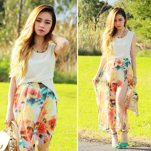 白色背心+橙色印花高叉长裙+绿色鱼嘴小高跟