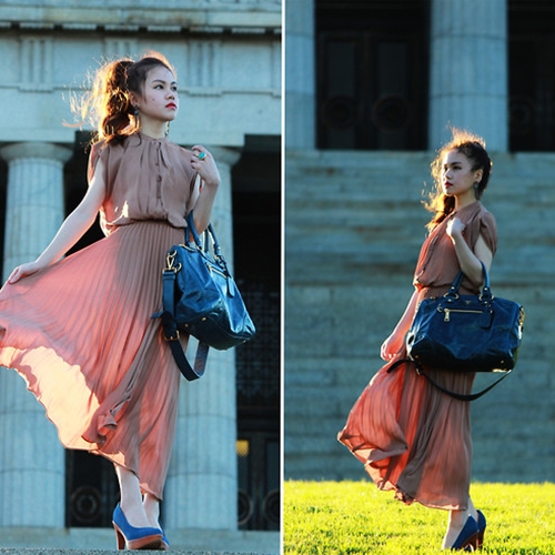 豆沙红竖褶连衣长裙+蓝色高跟鞋+黑色手提包