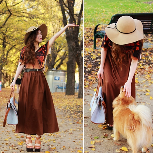 阔边草帽+蝴蝶T恤上衣+棕色伞裙+棕色绑带高跟
