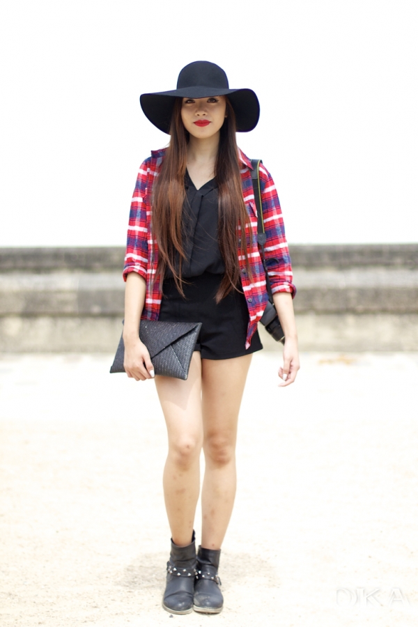 黑色阔边帽+红色方格衬衫+黑色V领上衣+黑色高腰裤+黑色铆钉靴+黑色信封包