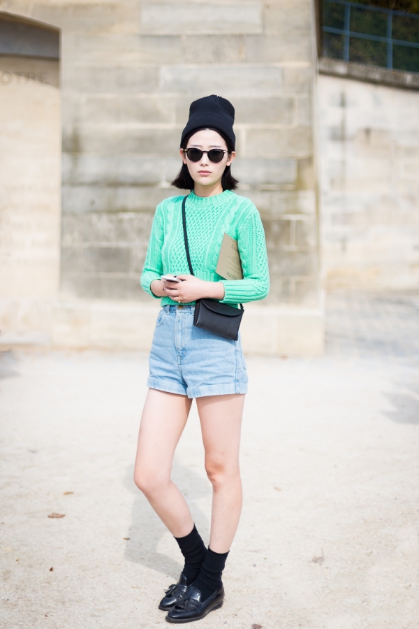 黑色毛线帽+薄荷绿毛线衫+牛仔短裤+黑色小皮鞋+黑色方包