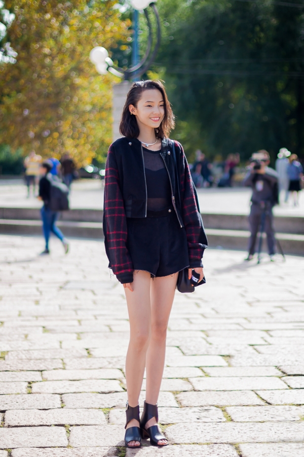 方格拼接外套+黑色透视衫+黑色高腰裤+黑色露趾凉鞋+黑色肩包