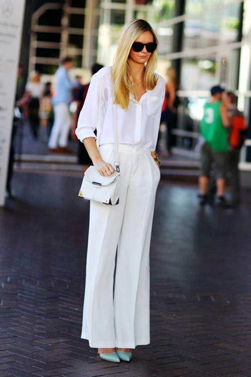 白色衬衫+白色阔腿西装裤+白色方包+蓝色尖头高跟鞋
