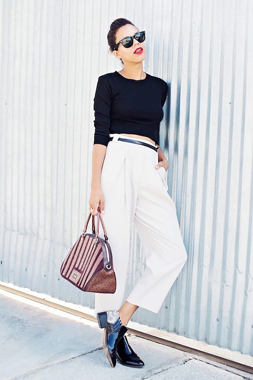 白色裤子+黑色上衣: